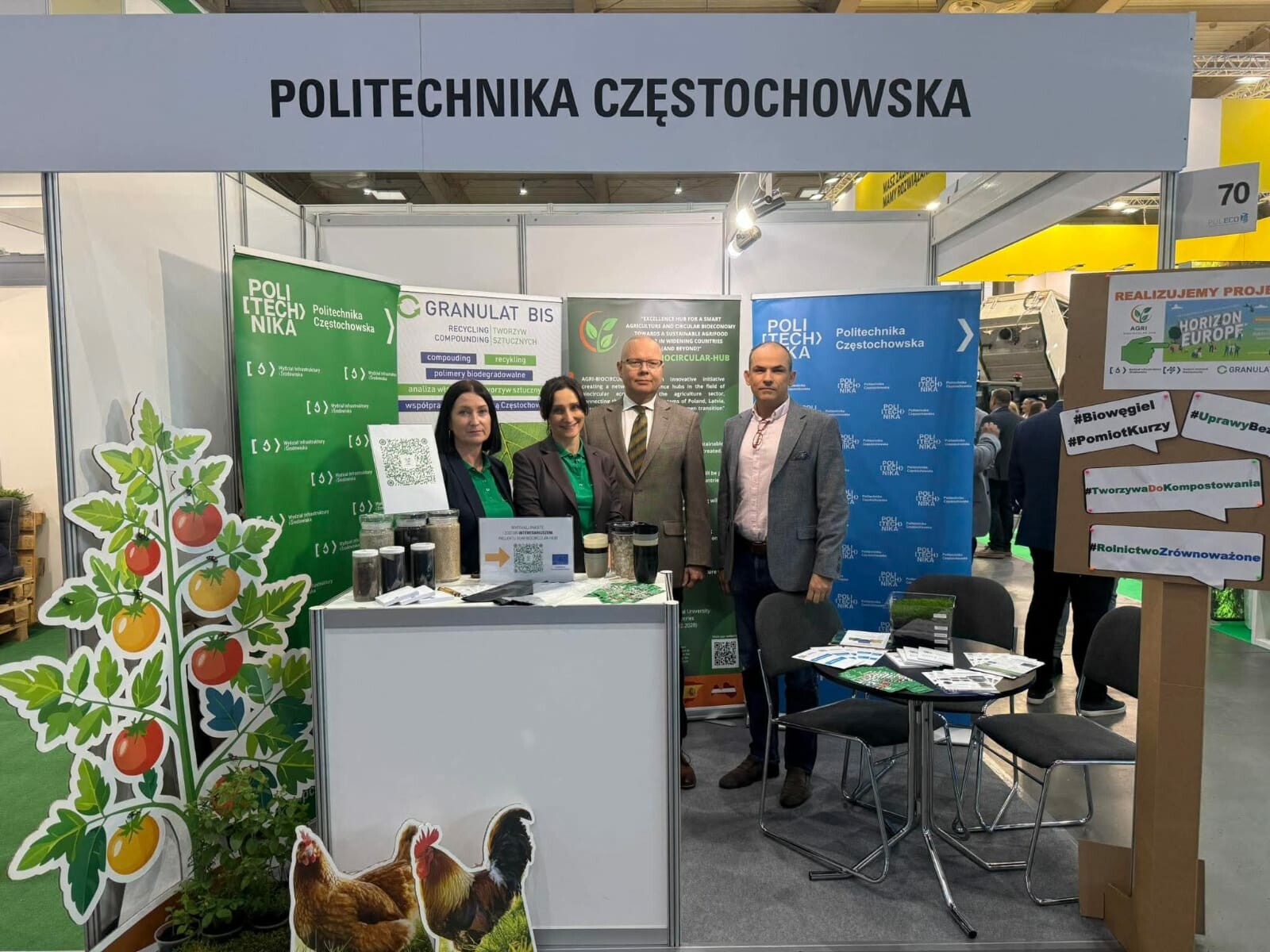 Naukowcy i naukowczynie z Wydziału Infrastruktury i Środowiska oraz Wydziału Inżynierii Mechanicznej czyli dr hab. inż. Krystyna Malińska, prof. PCz, dr inz. Danuta Dróżdż, dr inż. Katarzyna Wystalska, dr hab. inż. Przemysław Postawa, prof. PCz i dr hab. inż. Tomasz Stachowiak, prof. PCz (zespół projektu AGRI-BIOCIRCULAR-HUB), reprezentowali Uczelnię podczas targów. Zwiedzający i wystawcy na stoisku Politechniki Częstochowskiej mogli zobaczyć najnowsze prototypy „bioplastików” czyli biopochodne i biodegradowalne akcesoria do uprawy roślin, które pozwolą na ograniczenie powstawania odpadów z tworzyw sztucznych podczas uprawy roślin jadalnych (warzyw i owoców). O problemie powstawania i zagospodarowania odpadów z tworzyw sztucznych z rolnictwa opowiedział dr hab. inż. Przemysław Postawa, prof. PCz z Wydziału Inżynierii Mechanicznej podczas wystąpienia pt. „Uprawy bez plastiku? Wykorzystanie tworzyw biodegradowalnych i biopochodnych w rolnictwie zrównoważonym na przykładzie realizacji projektu AGRI-BIOCIRCULAR-HUB”.