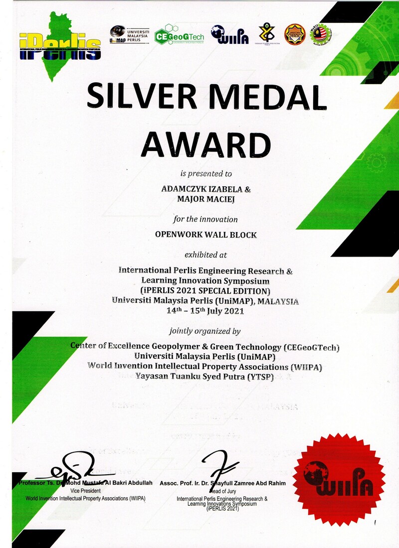 „International Perlis Engineering Research & Learning Innovation Symposium 2021” uzyskanie srebrnego medalu za: Openwork wall block
