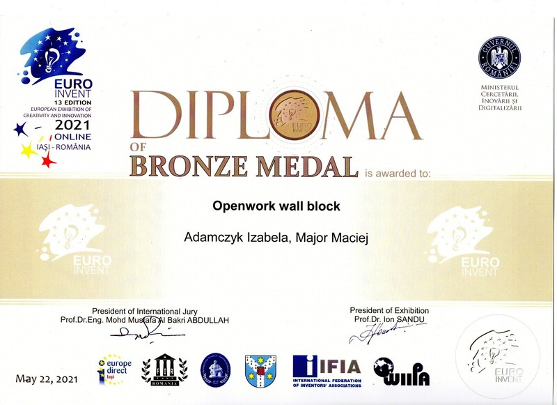 „Euro Invent 13 edition 2021” uzyskanie brązowego medalu za: Openwork wall block.