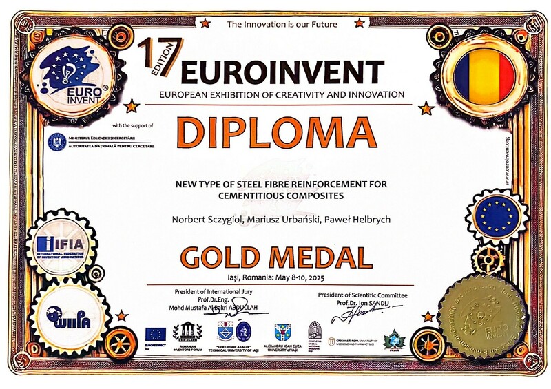 „17 European Exhibition of Creativity and Innovation 2025” uzyskanie złotego medalu za: New type of steel fibre Reinforcement for cementtitious composites.