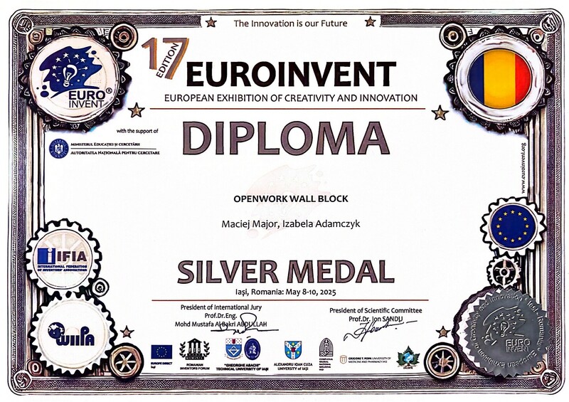 „17 European Exhibition of Creativity and Innovation 2025” uzyskanie srebrnego medalu za: Openwork wall block.